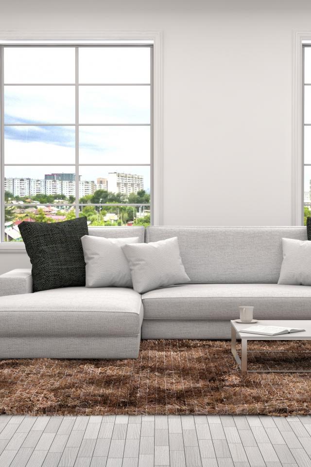 Обои Гостиная комната с большим диваном и окнами в сером цвете