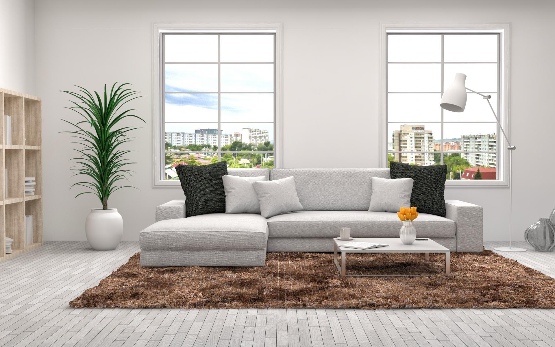 Обои Гостиная комната с большим диваном и окнами в сером цвете