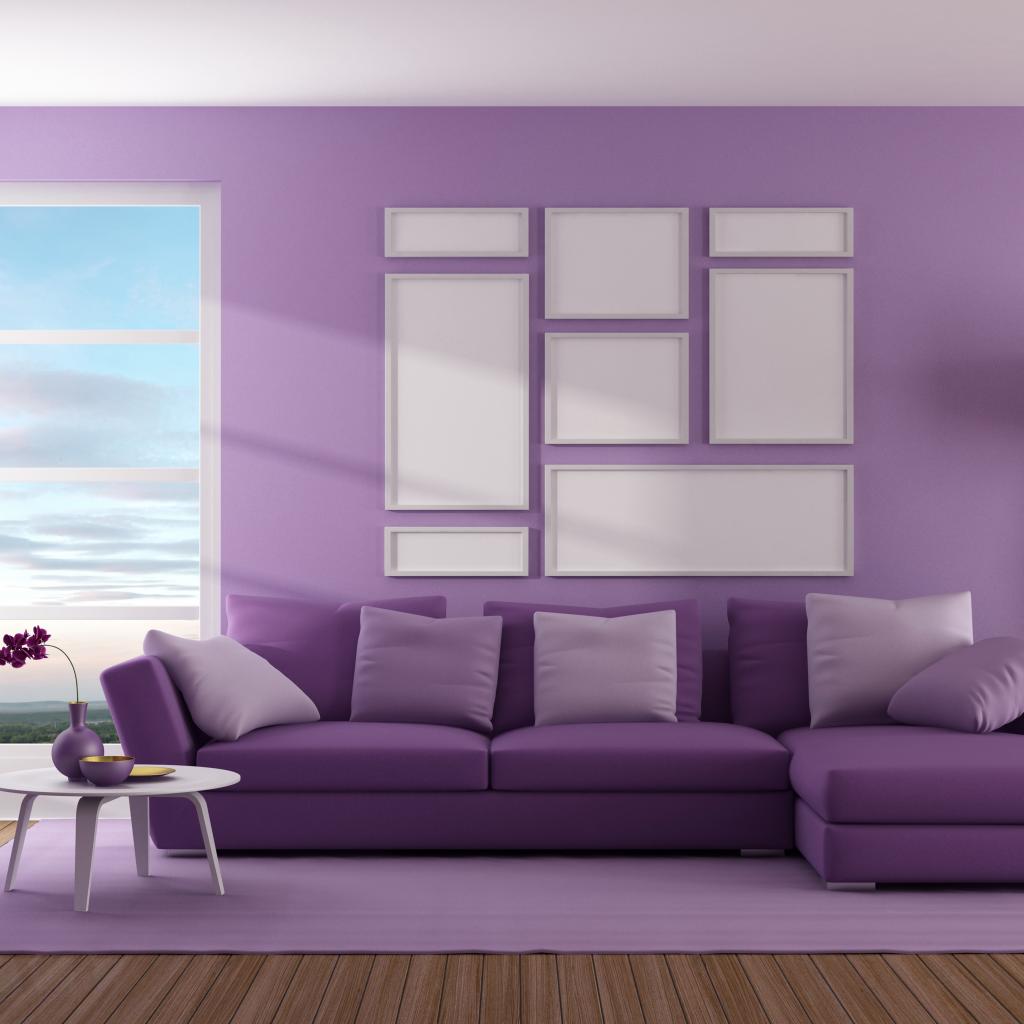 Обои Гостиная комната с диваном у окна в фиолетовом цвете
