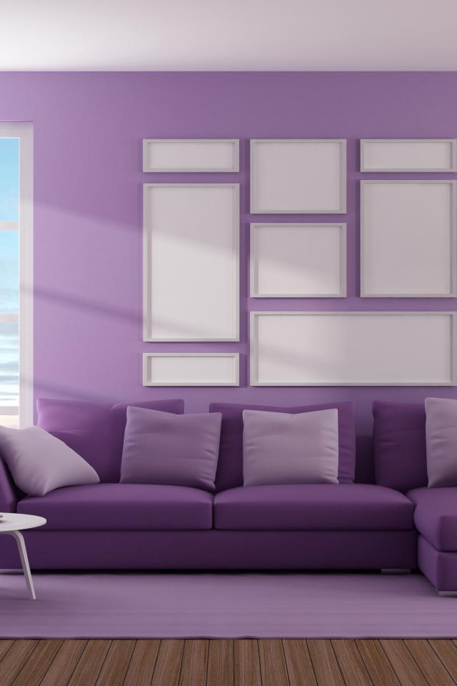 Обои Гостиная комната с диваном у окна в фиолетовом цвете