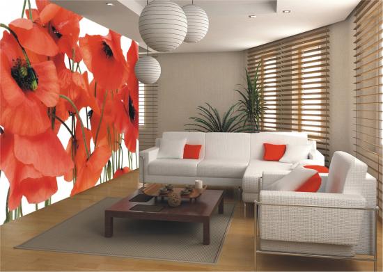 Обои Гостиная комната с диваном и картиной с маками на стене