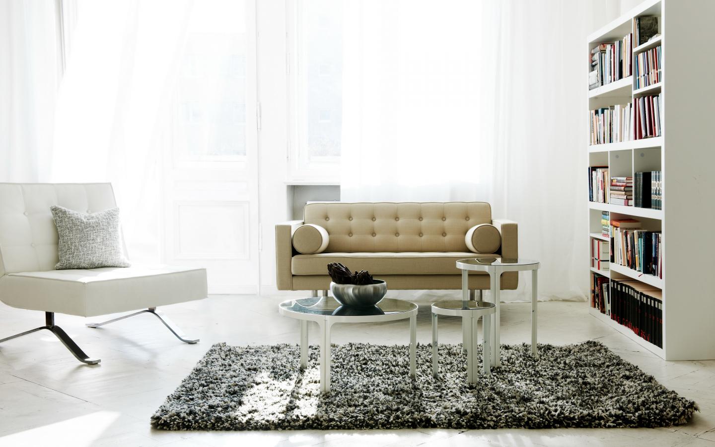 Обои Светлая гостиная с книжным шкафом, диваном и креслом