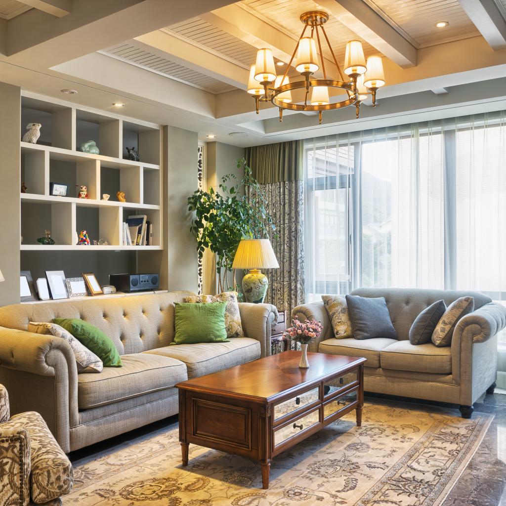 Обои Много мягкой мебели в гостиной комнате с люстрой