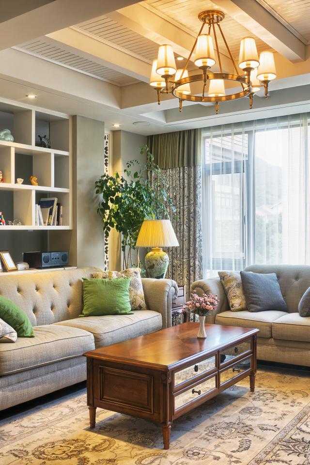 Обои Много мягкой мебели в гостиной комнате с люстрой