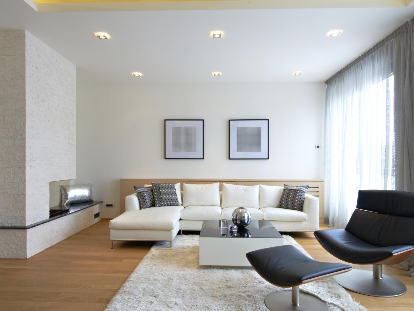 Обои Гостиная комната с белым кожаным диваном и черным креслом у окна