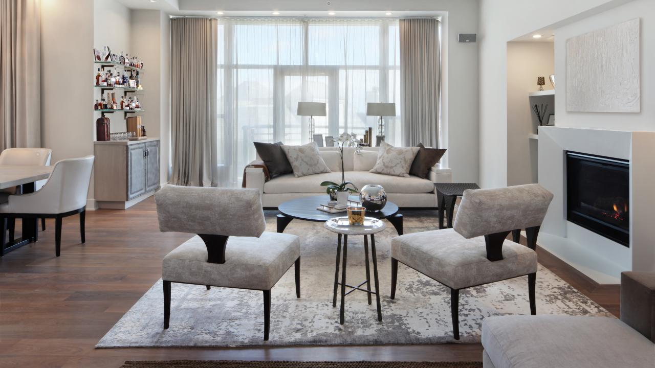 Обои Красивая светлая гостиная с камином и большим окном