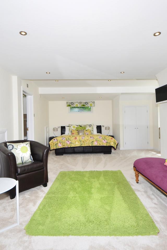 Обои Большая гостиная с высокими белыми стенами и мебелью
