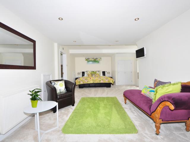 Обои Большая гостиная с высокими белыми стенами и мебелью