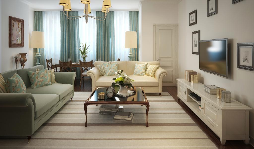Обои Гостиная комната с голубыми шторами на окне