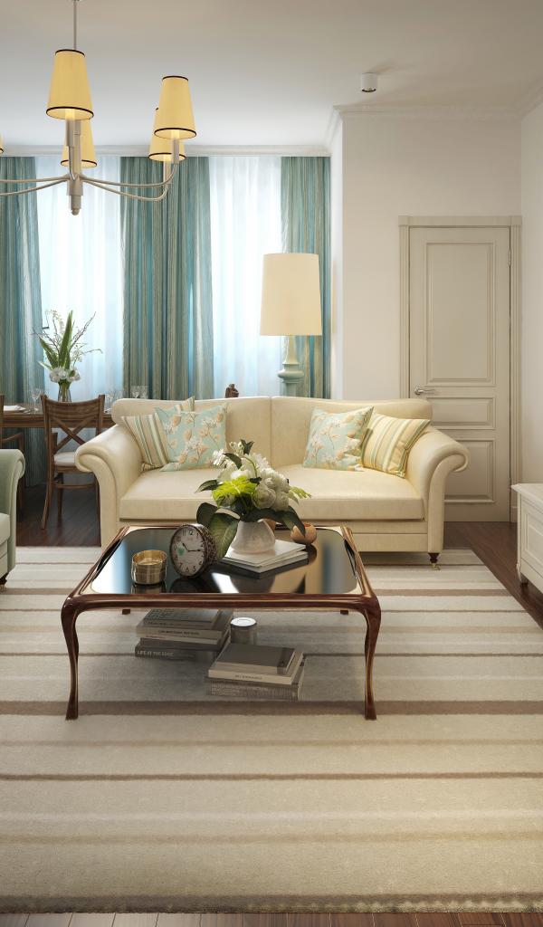 Обои Гостиная комната с голубыми шторами на окне