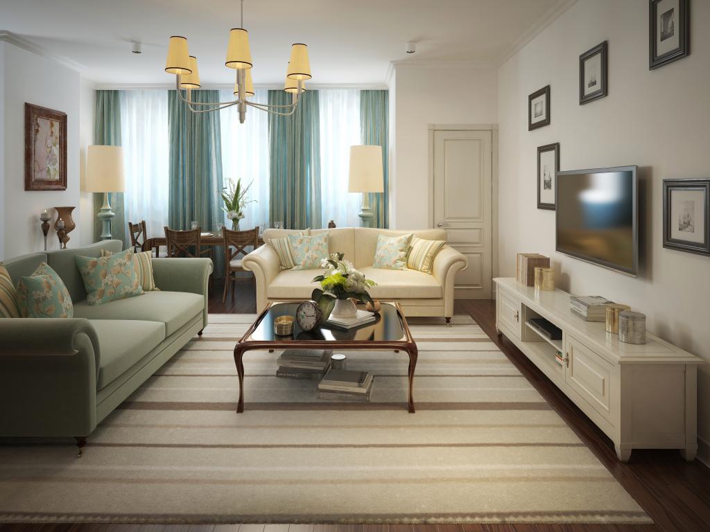Обои Гостиная комната с голубыми шторами на окне