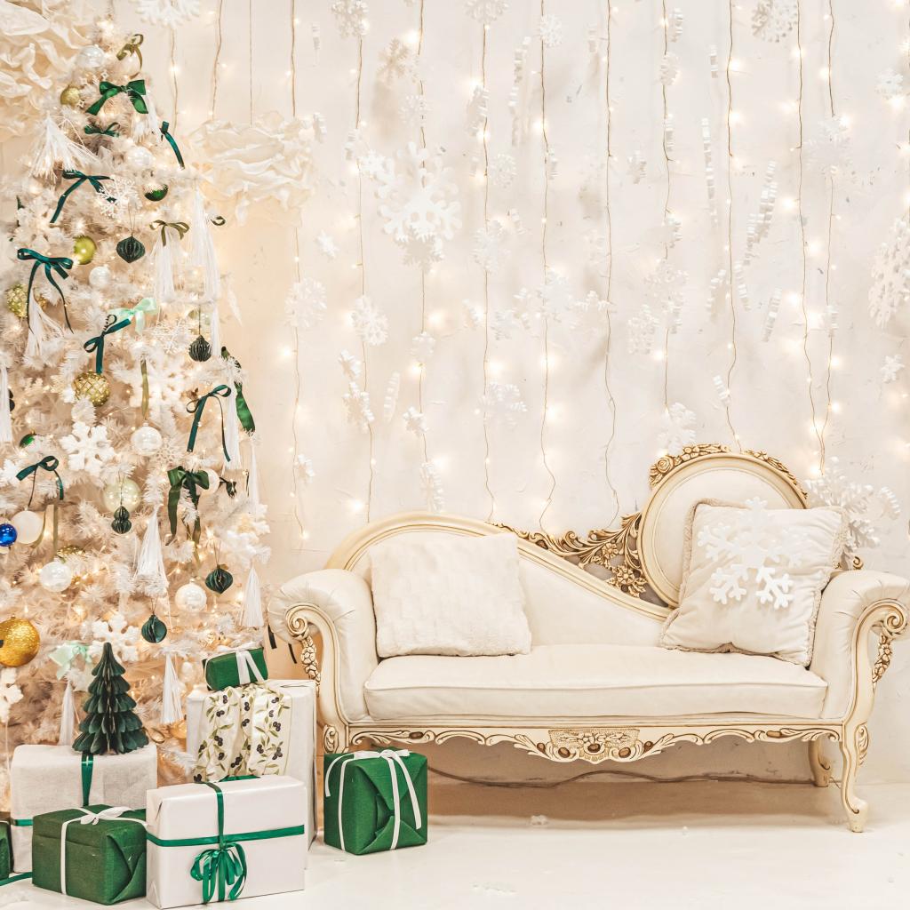 Обои Диван и наряженная ель на Рождество