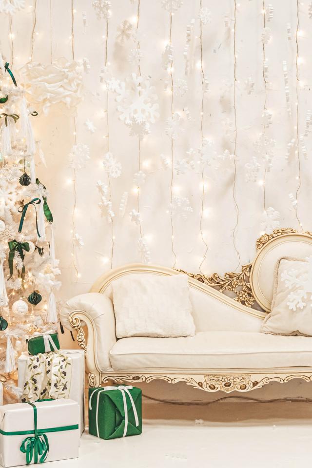 Обои Диван и наряженная ель на Рождество