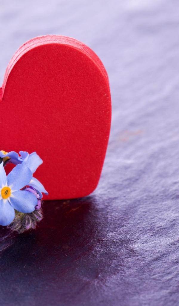 Обои Красное сердце и нежные голубые цветы