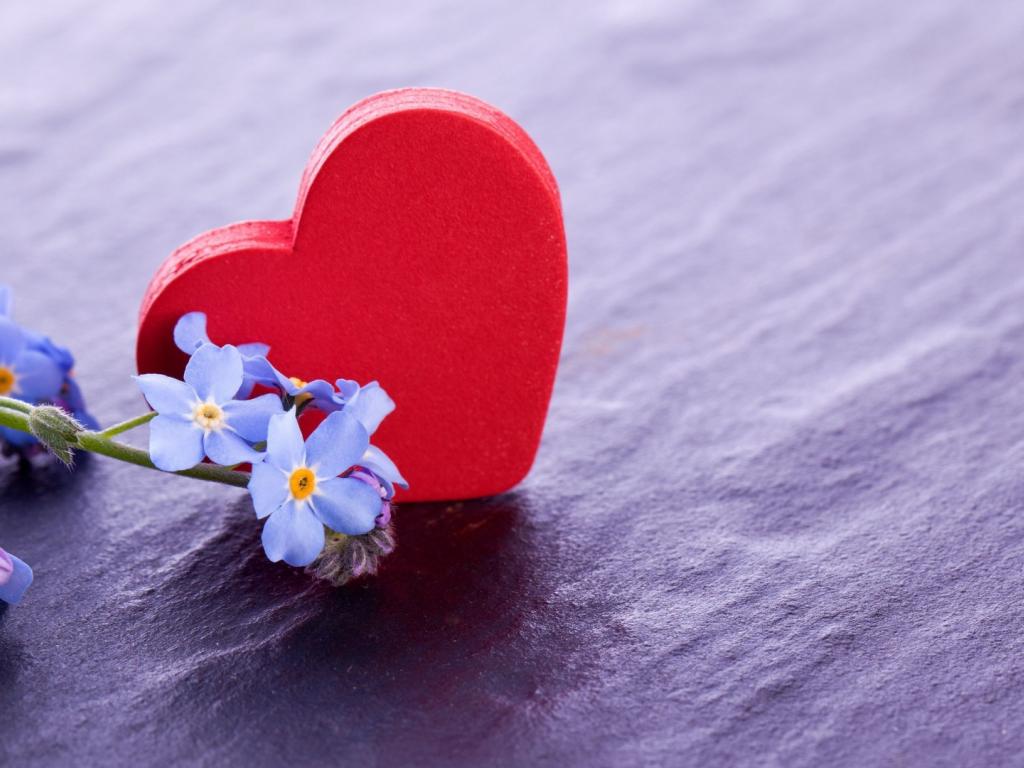 Обои Красное сердце и нежные голубые цветы