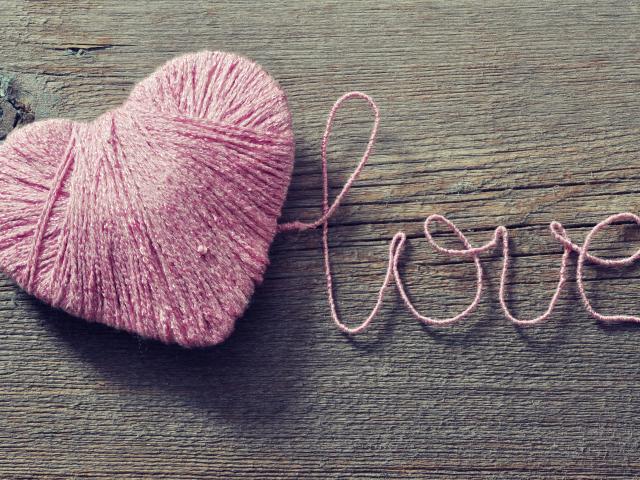 Обои Надпись Love из розовых ниток на деревянном столе