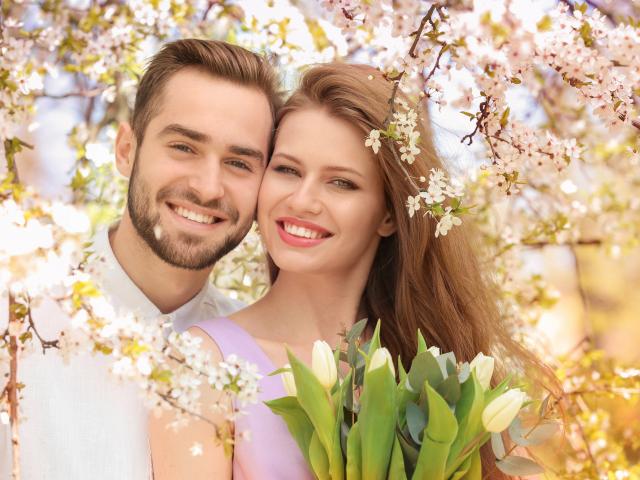 Обои Улыбающаяся влюбленная пара у цветущего дерева