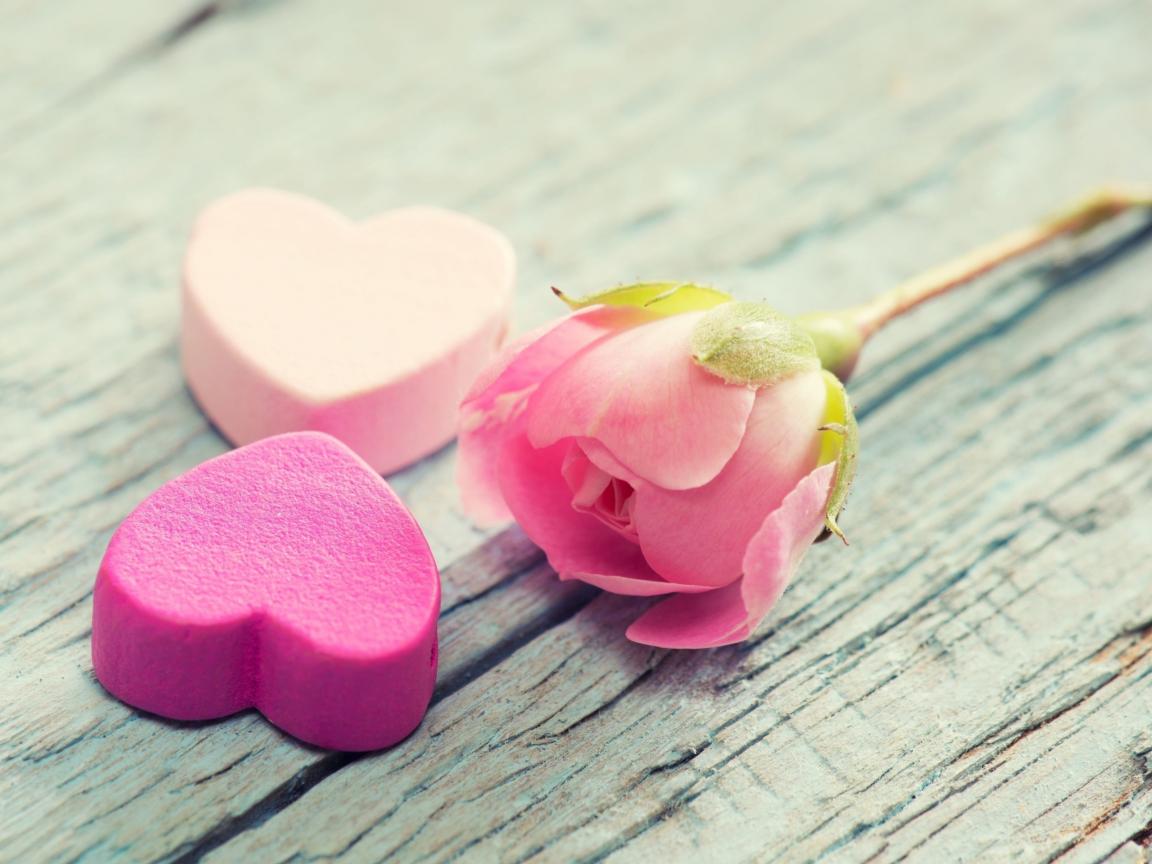 Обои Два розовых сердца и розовая роза лежат на деревянной поверхности