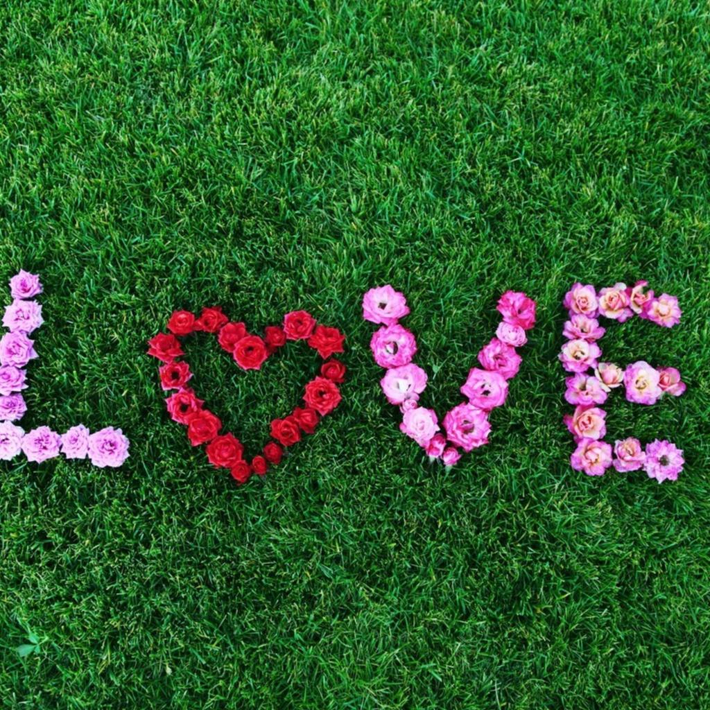 Обои Надпись Любовь выложена из роз на зеленой траве