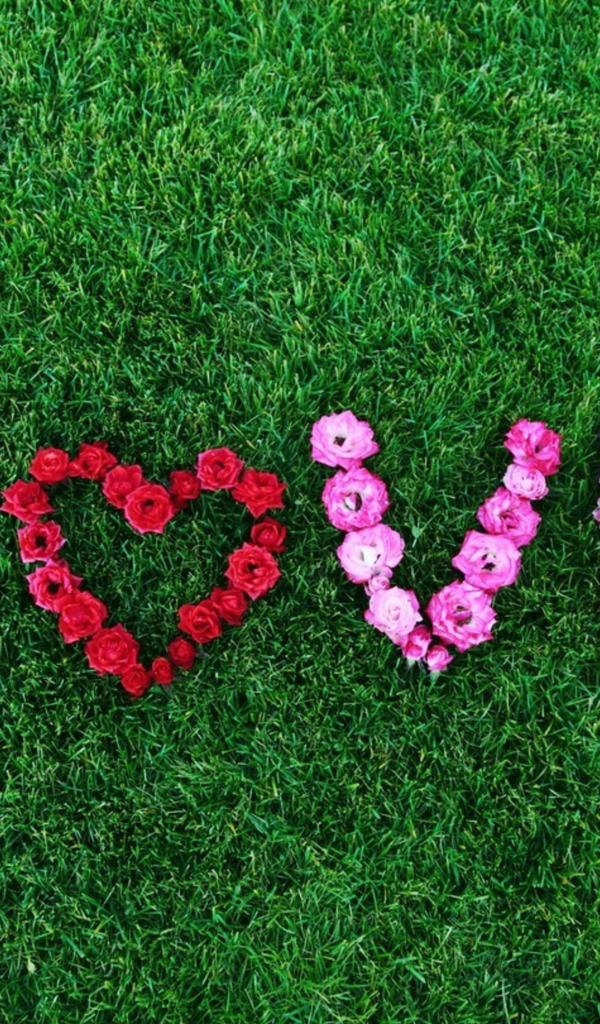 Обои Надпись Любовь выложена из роз на зеленой траве