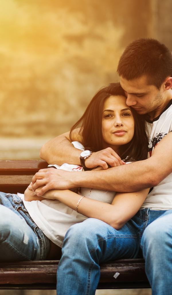 Обои Влюбленная пара сидит на деревянной лавке в парке