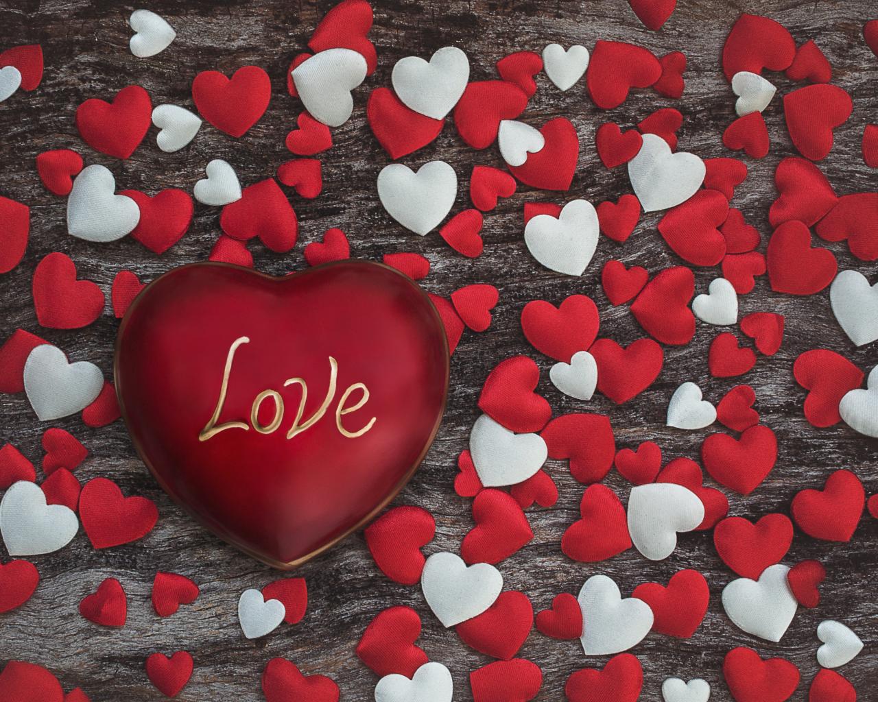 Обои Большое красное сердце с надписью Любовь среди маленьких сердечек