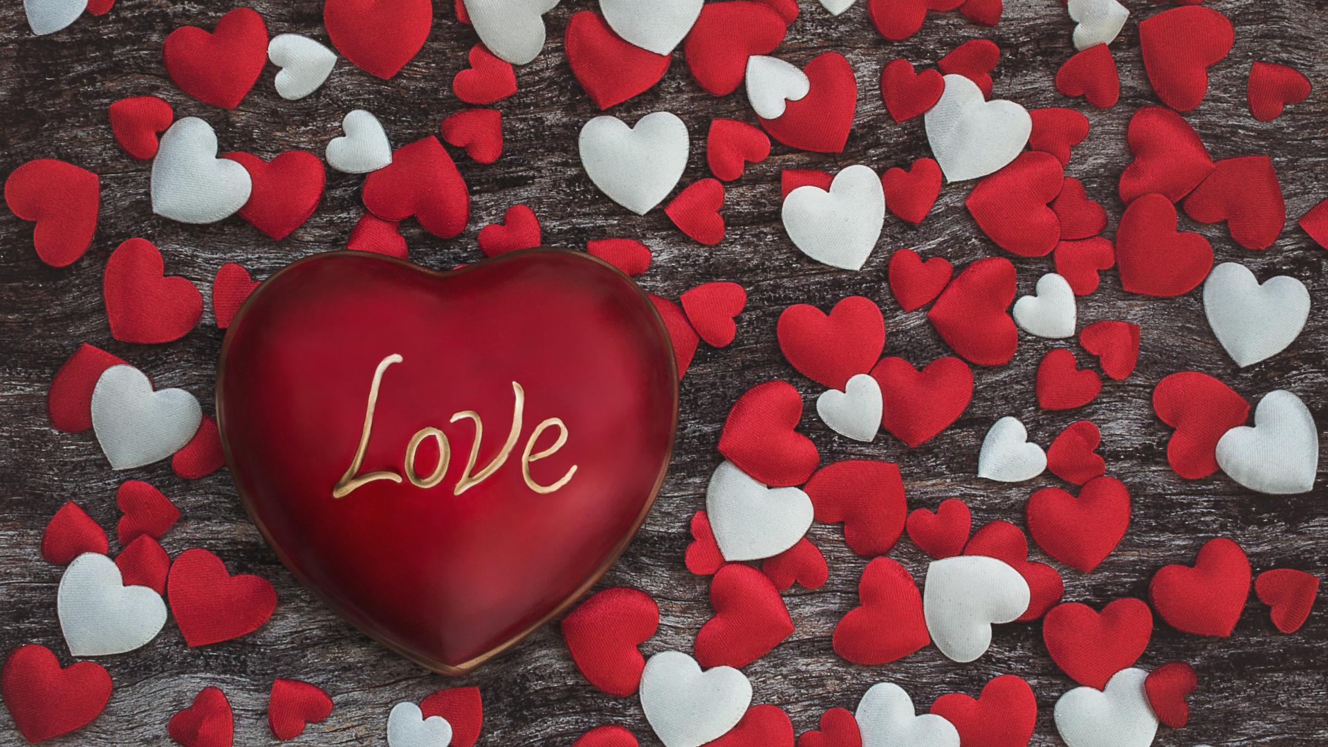 Обои Большое красное сердце с надписью Любовь среди маленьких сердечек