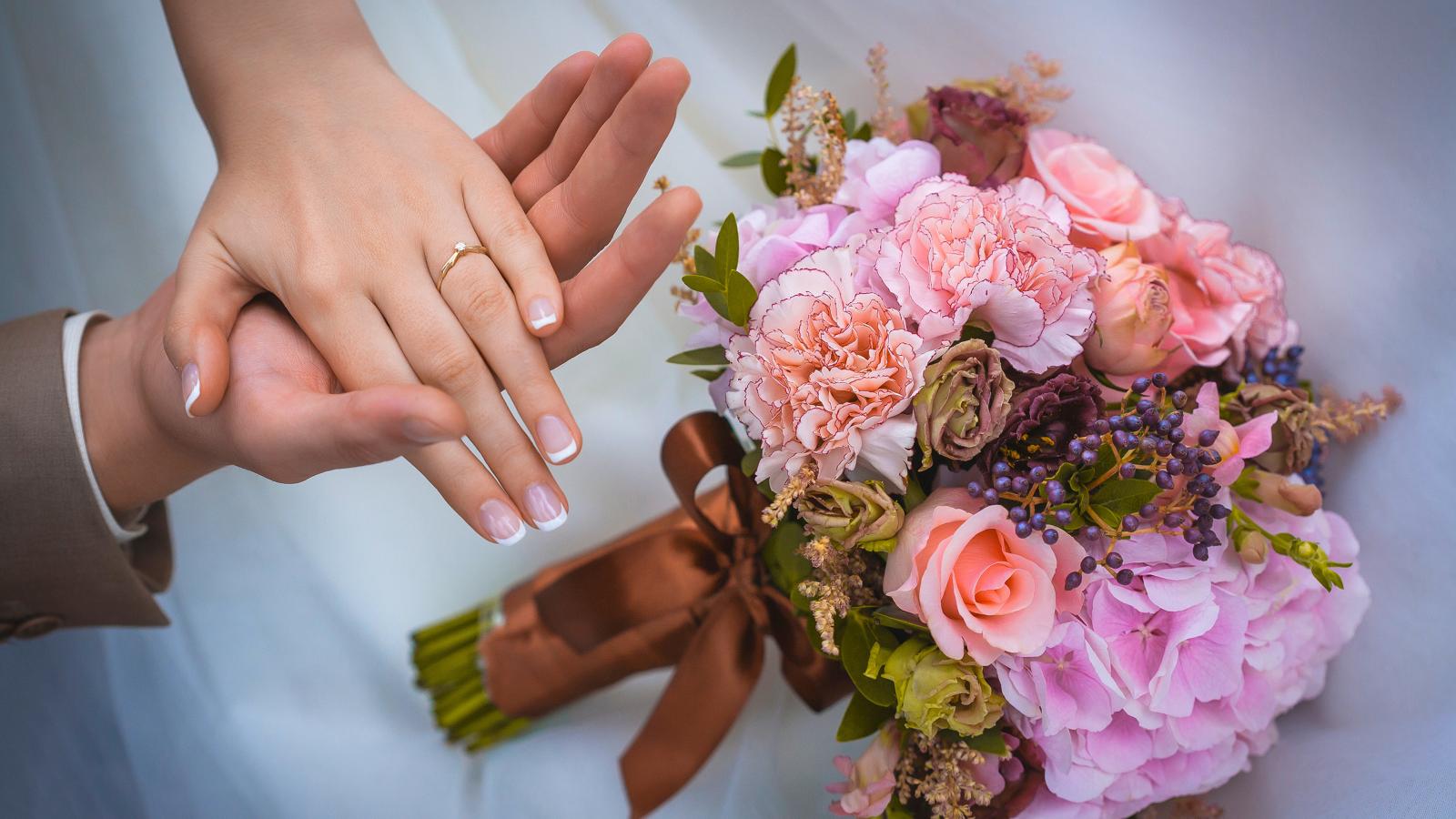 Обои Руки влюбленной пары со свадебный букетов