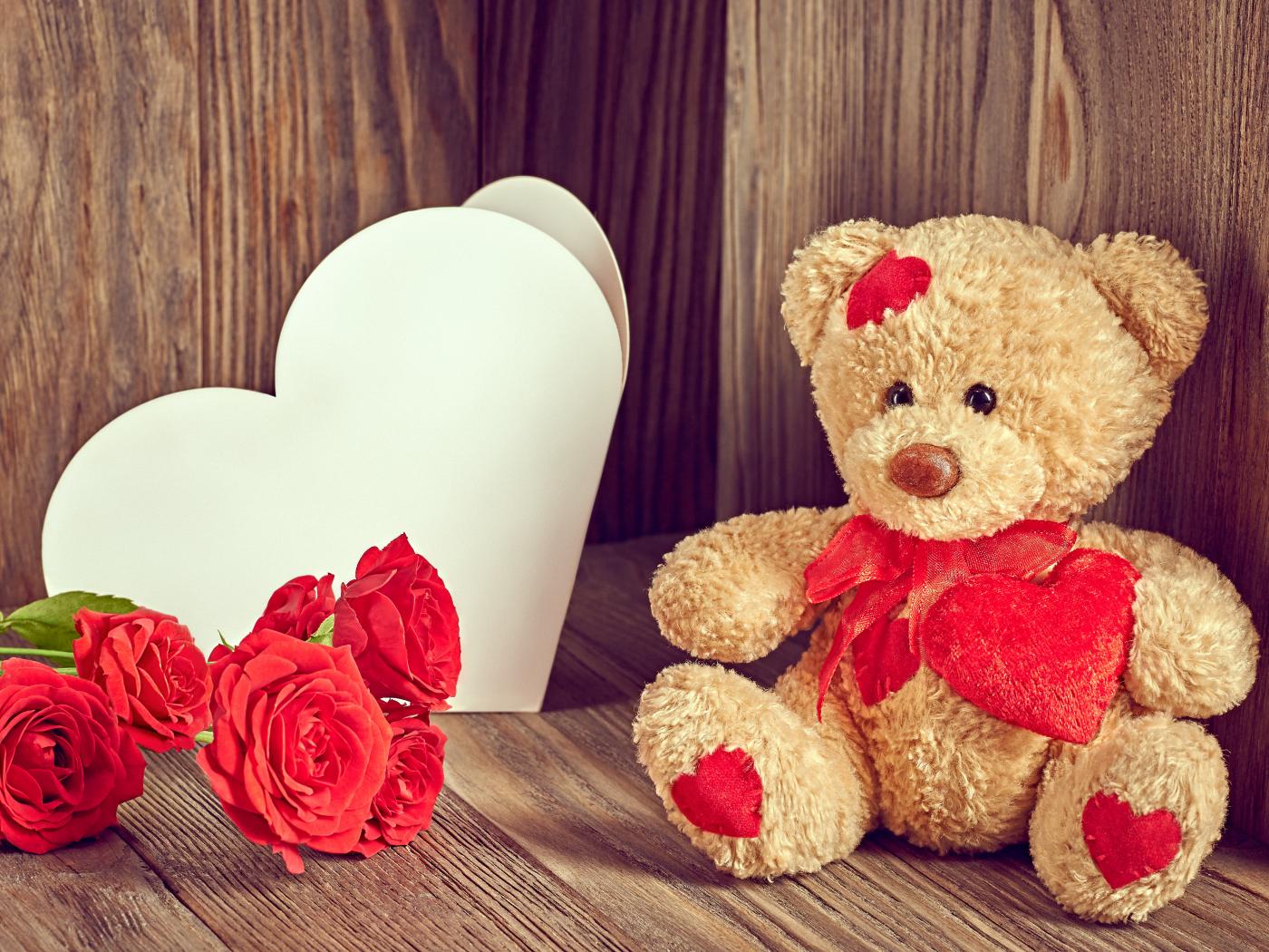 Обои Плюшевый медведь с большим белым бумажным сердцем и красными розами