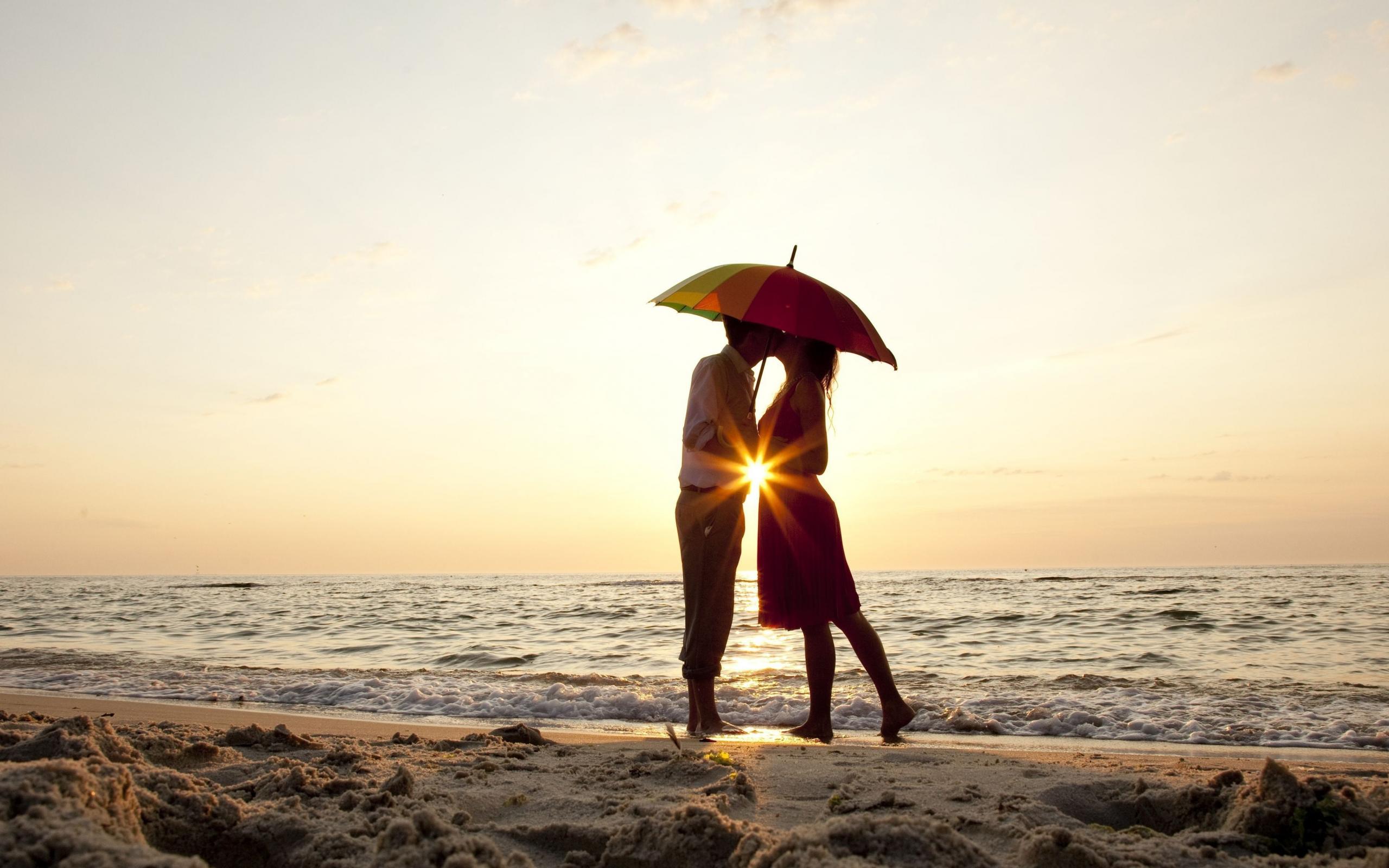 Обои Влюбленная пара на пляже стоит под зонтом на закате