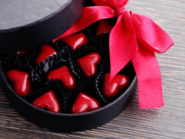 Обои Коробка шоколадных конфет в форме сердца с красной лентой