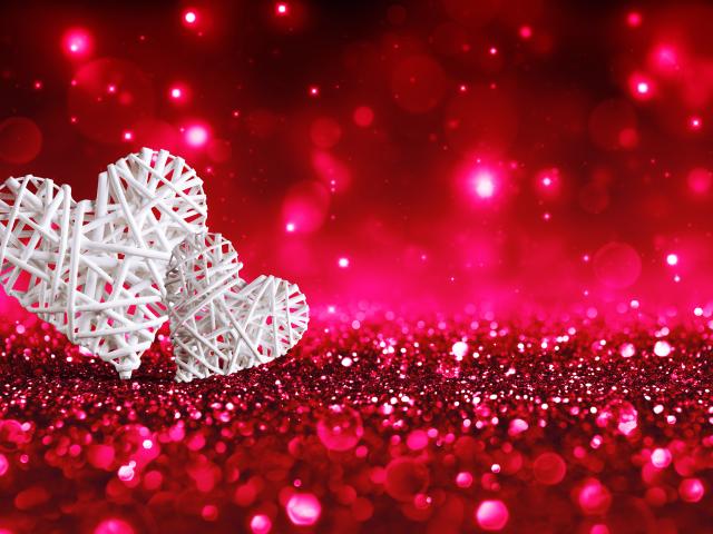 Обои Два белых плетеных сердца на мерцающем красном фоне
