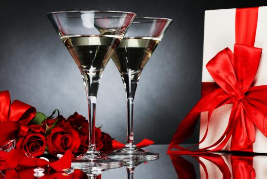 Обои Два бокала с мартини, подарком и красными розами для любимой