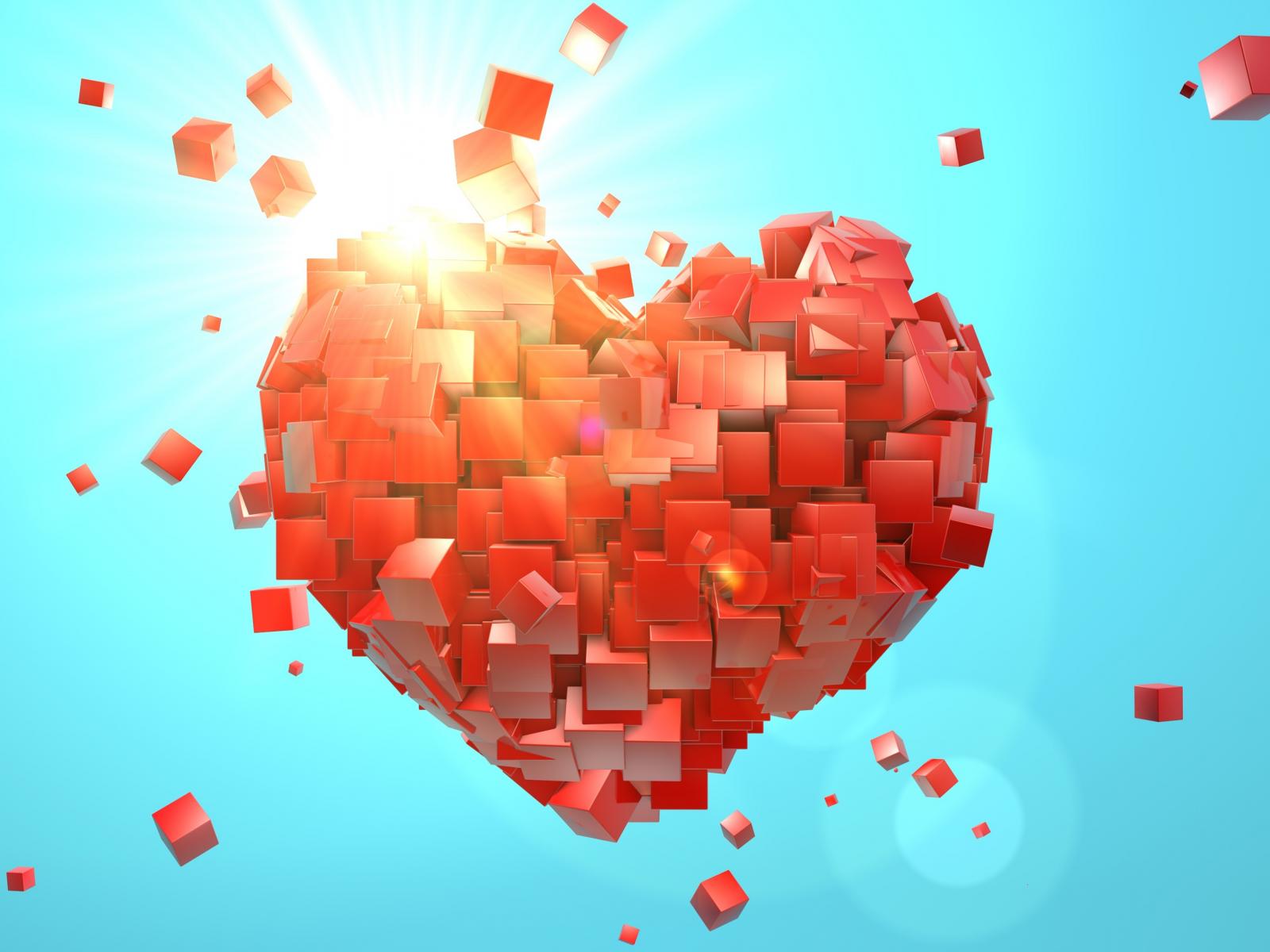 Обои Сердце из красных кубиков на голубом фоне