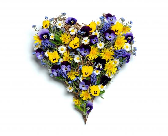 Обои Сердце из роз и цветов хризантемы на белом фоне