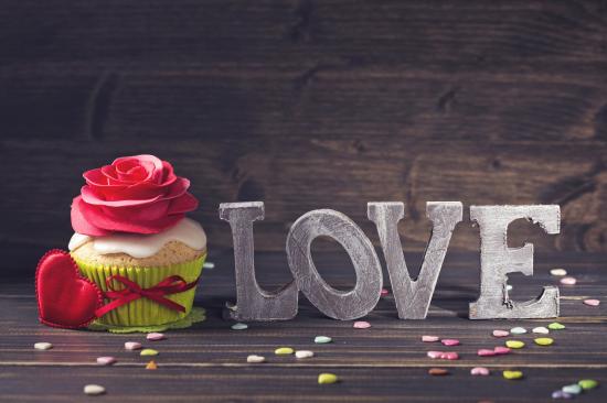 Обои Надпись Любовь с красивым кексом с красным сердцем