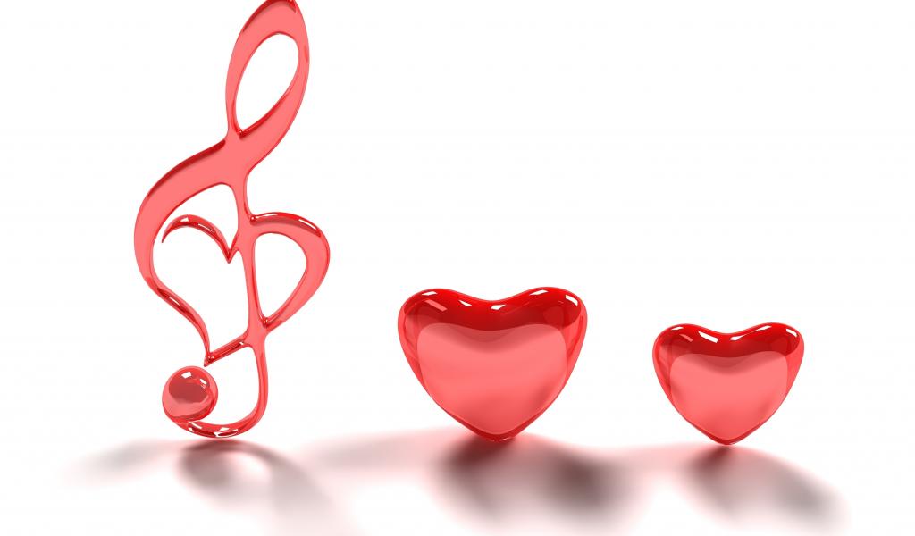 » Обои Два красных сердца и нота на белом фоне
