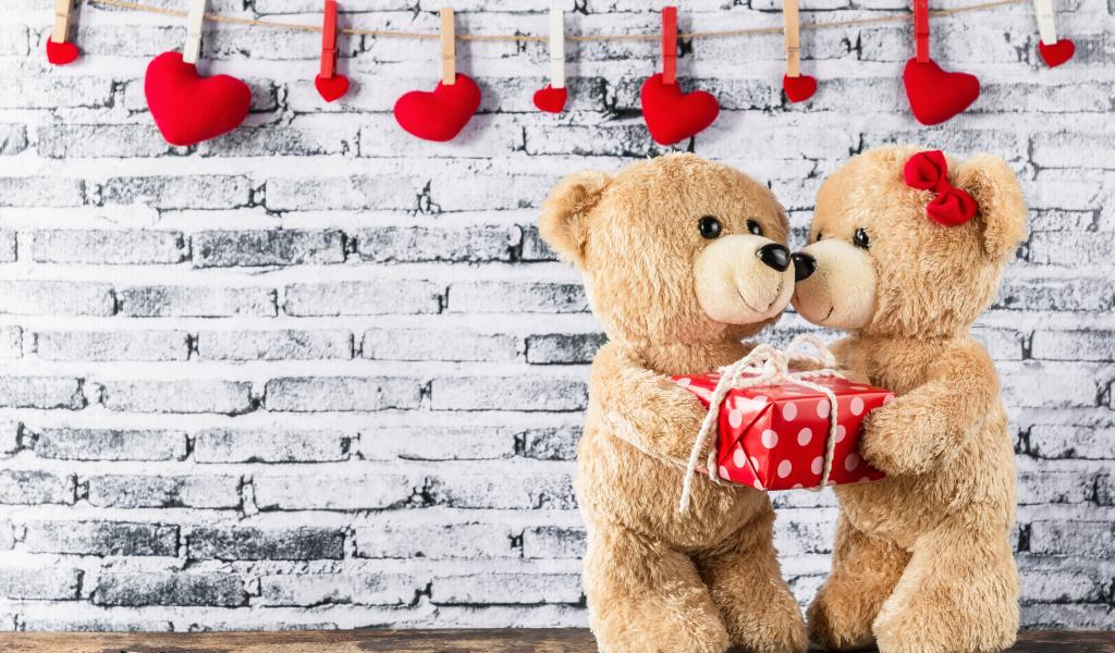 Обои Влюбленные плюшевые мишки на фоне стены с сердечками