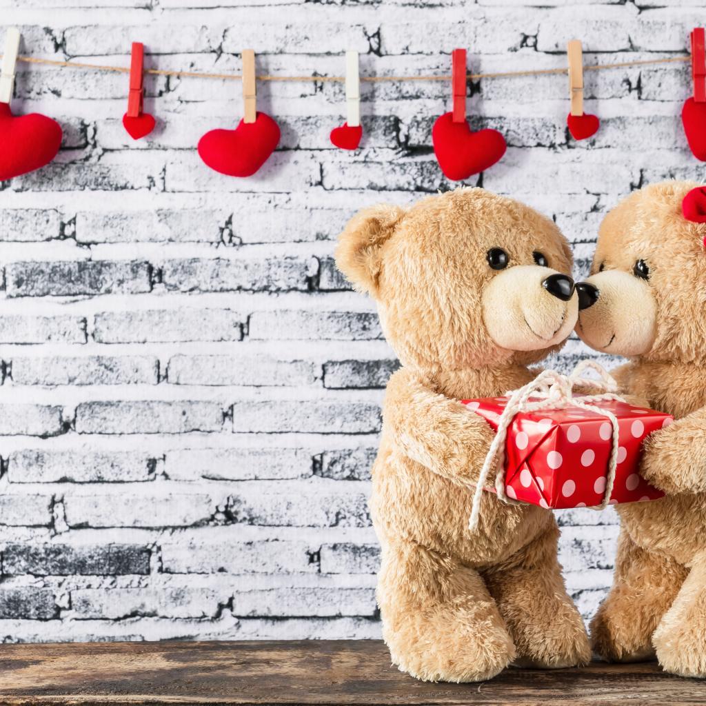 Обои Влюбленные плюшевые мишки на фоне стены с сердечками