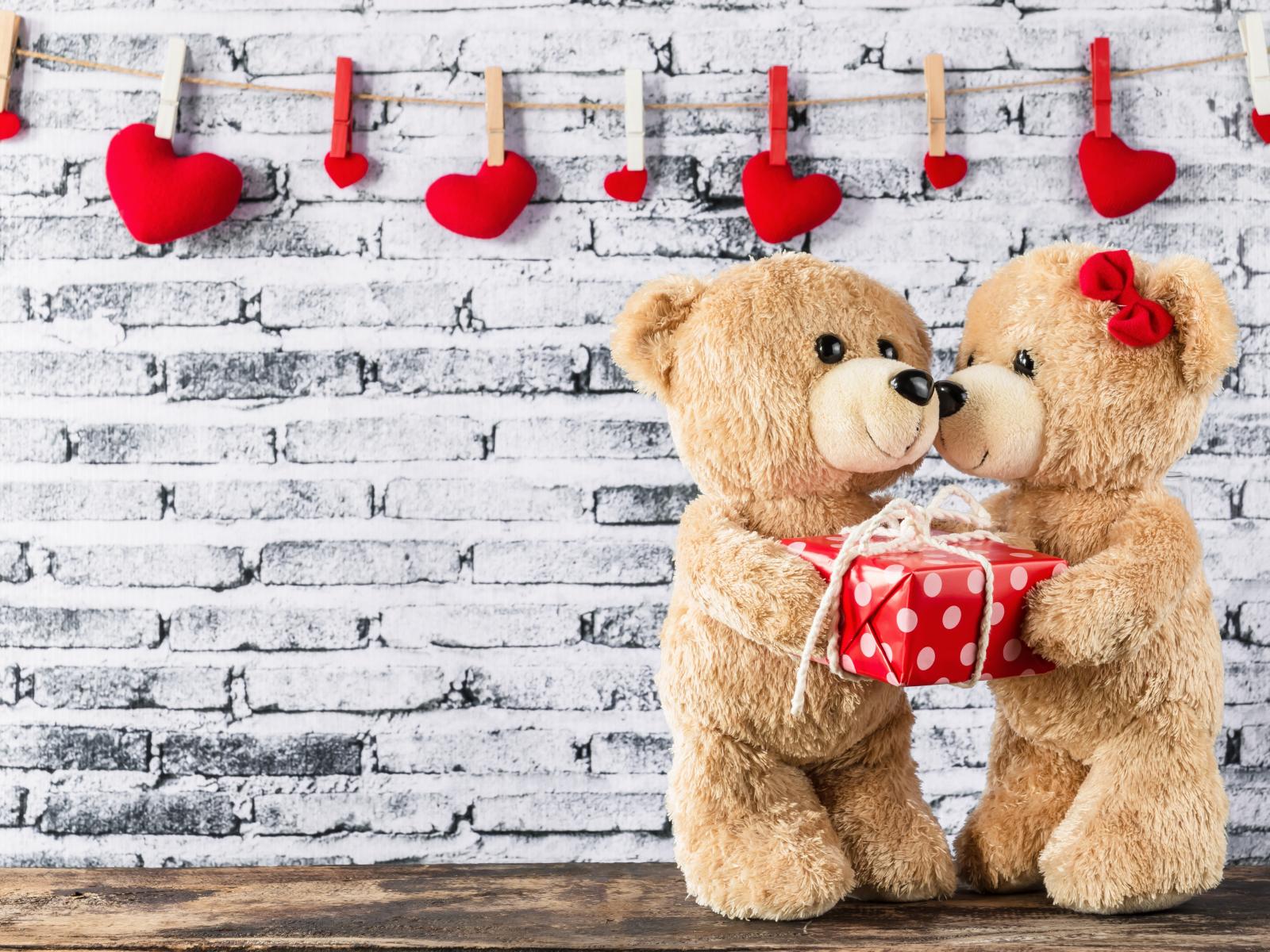 Обои Влюбленные плюшевые мишки на фоне стены с сердечками