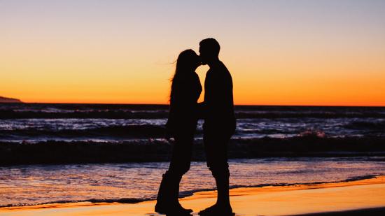 Обои Поцелуй влюбленной пары на берегу моря на закате
