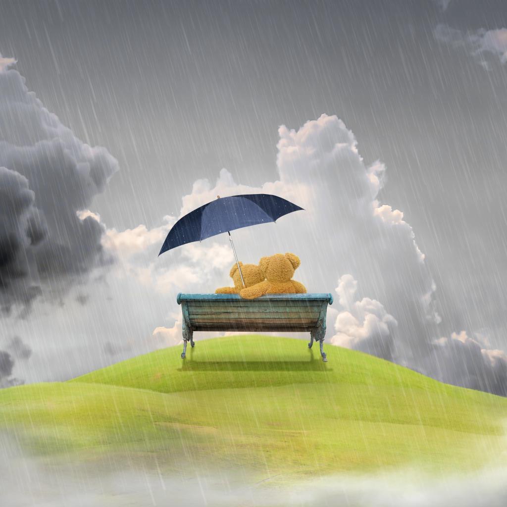 Обои Влюбленные плюшевые мишки на лавке под дождем