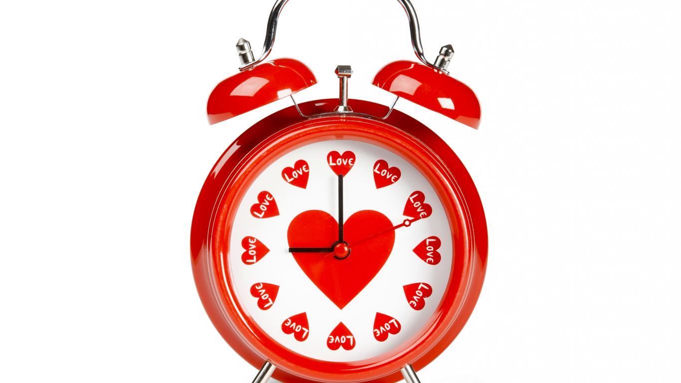 Обои Красный будильник с сердечками на белом фоне