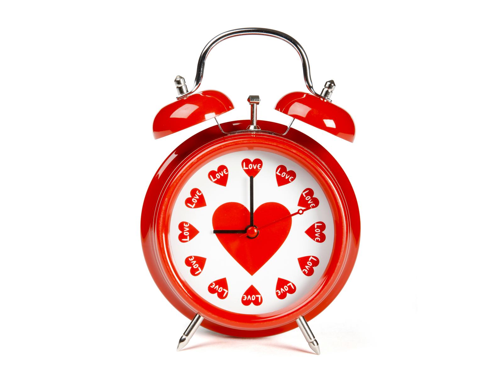 Обои Красный будильник с сердечками на белом фоне