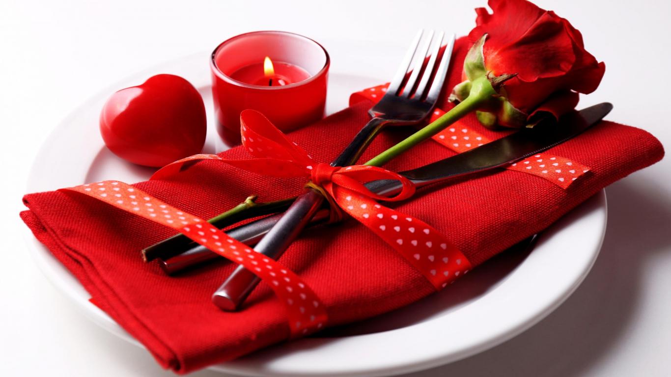 Обои Роза, столовые приборы и зажженная свеча на белой тарелке