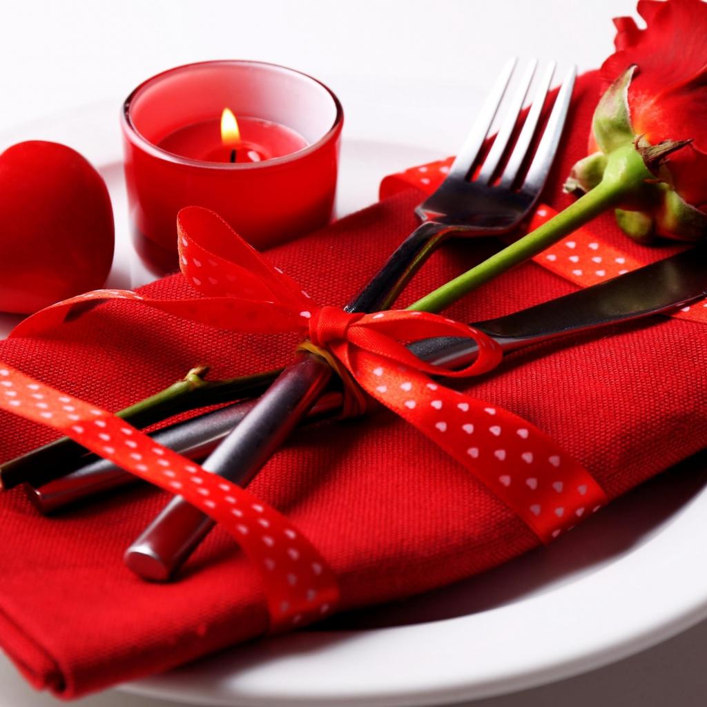 Обои Роза, столовые приборы и зажженная свеча на белой тарелке