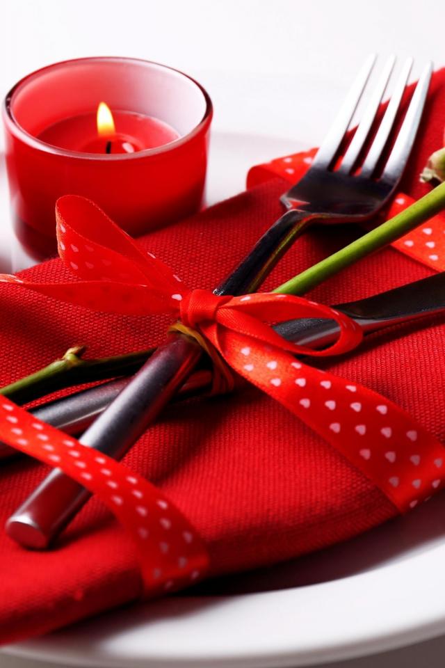 Обои Роза, столовые приборы и зажженная свеча на белой тарелке