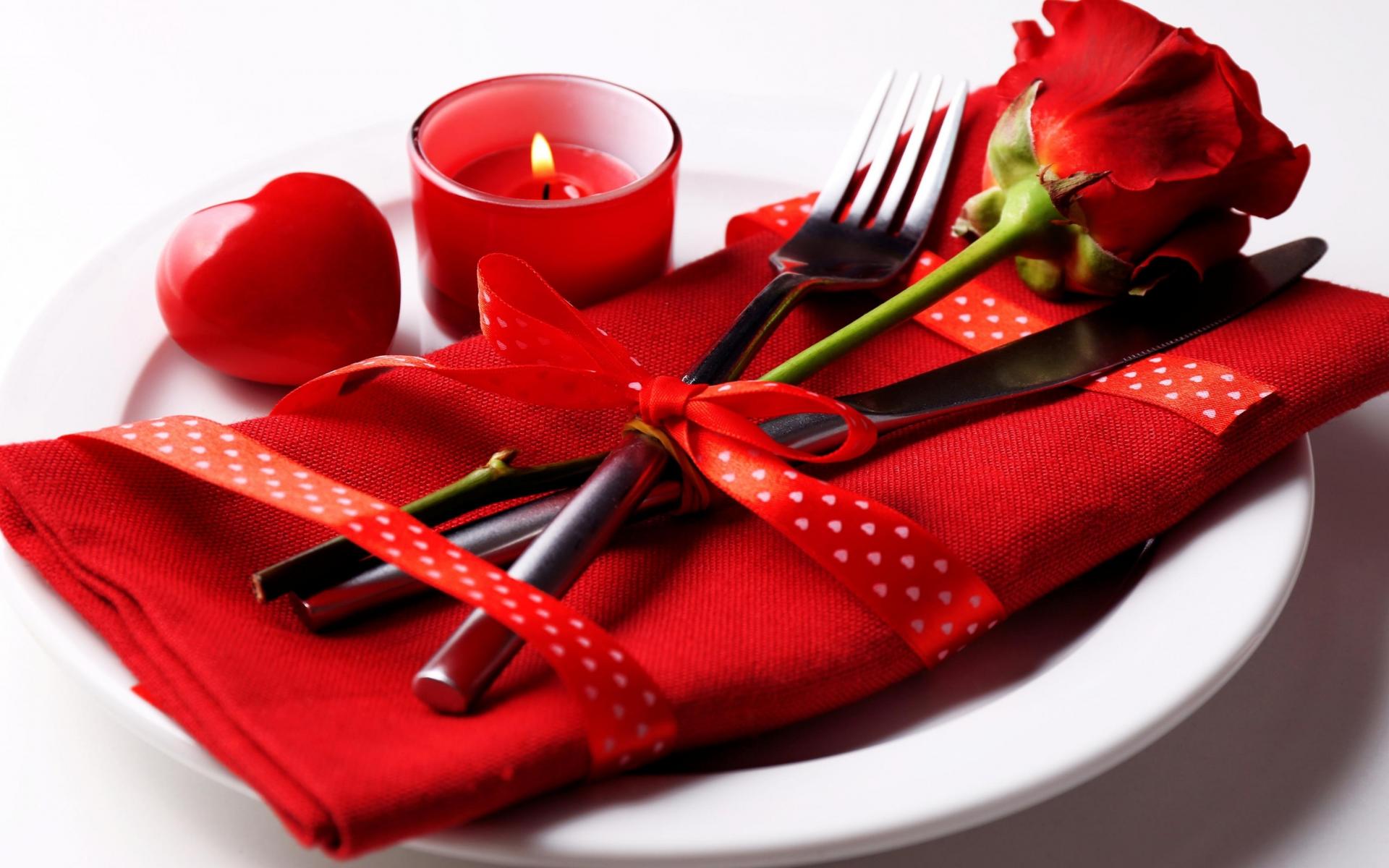 Обои Роза, столовые приборы и зажженная свеча на белой тарелке