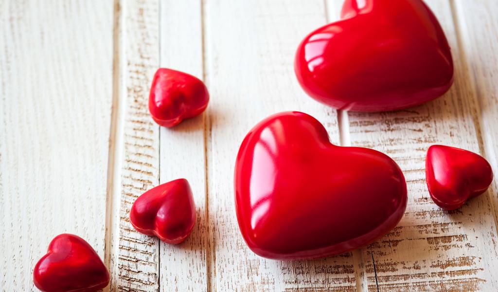 Обои Красные сердца на деревянной поверхности