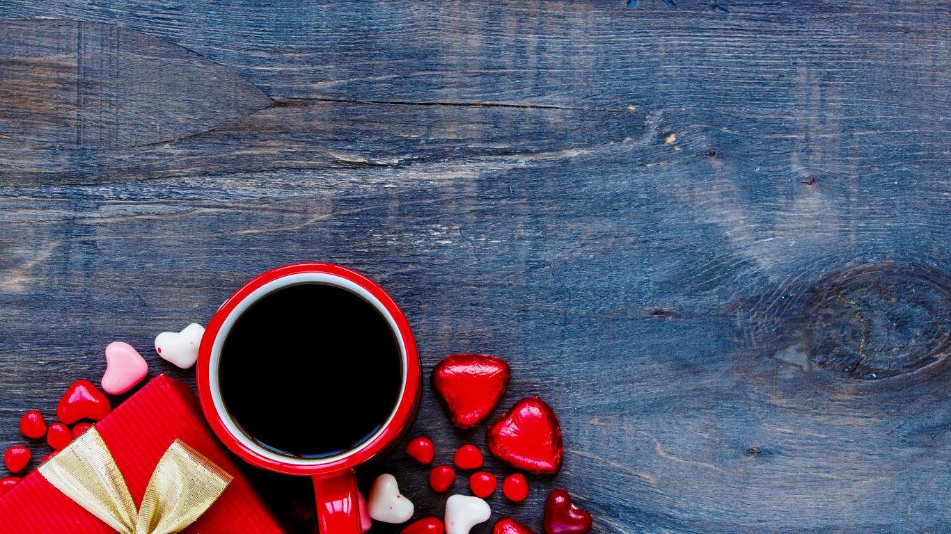 Обои Красная чашка кофе, сердечки и подарок на деревянном фоне